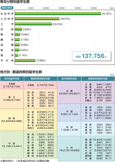 日本への留学生数(2)専攻分野・地方別