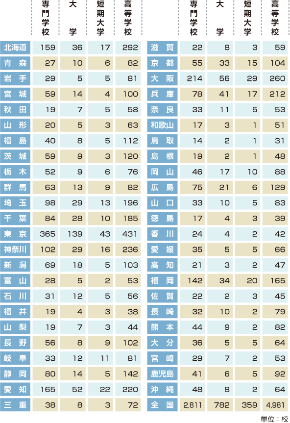 都道府県別/専門学校・大学・短期大学・高等学校