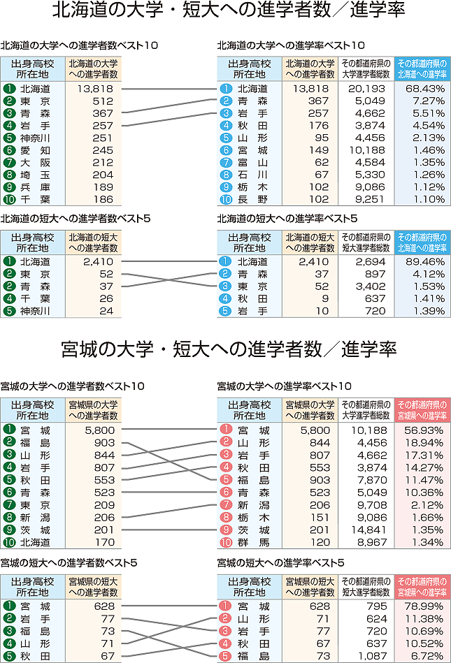 北海道、宮城の大学・短大への流動(2014年)