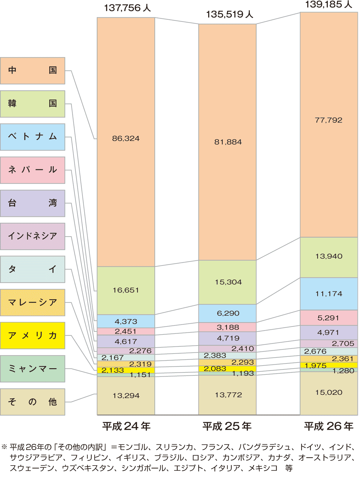 | データ資料: | 「平成26年度外国人留学生在籍状況調査結果」独立行政法人日本学生支援機構 |