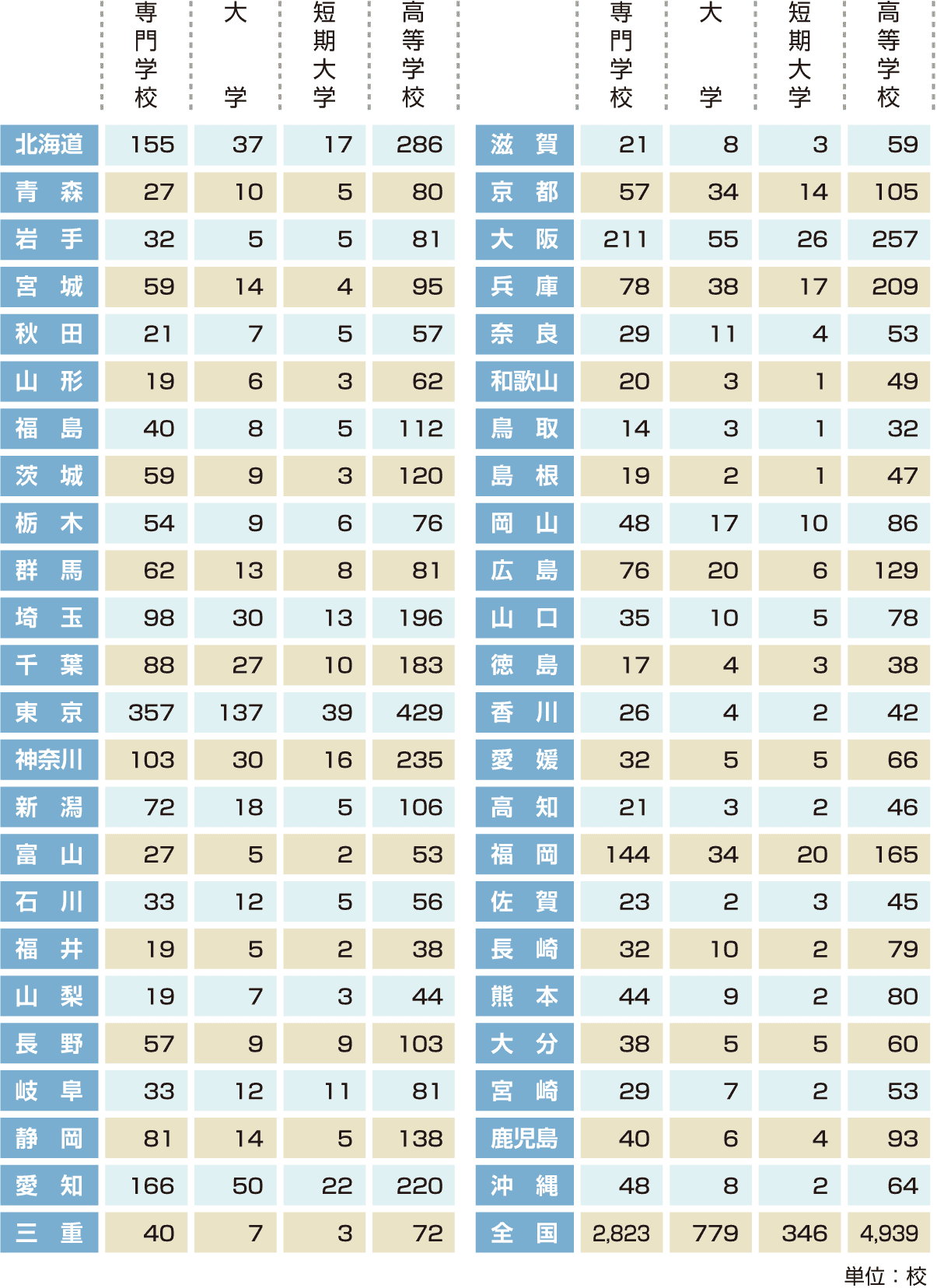 都道府県別/専門学校・大学・短期大学・高等学校