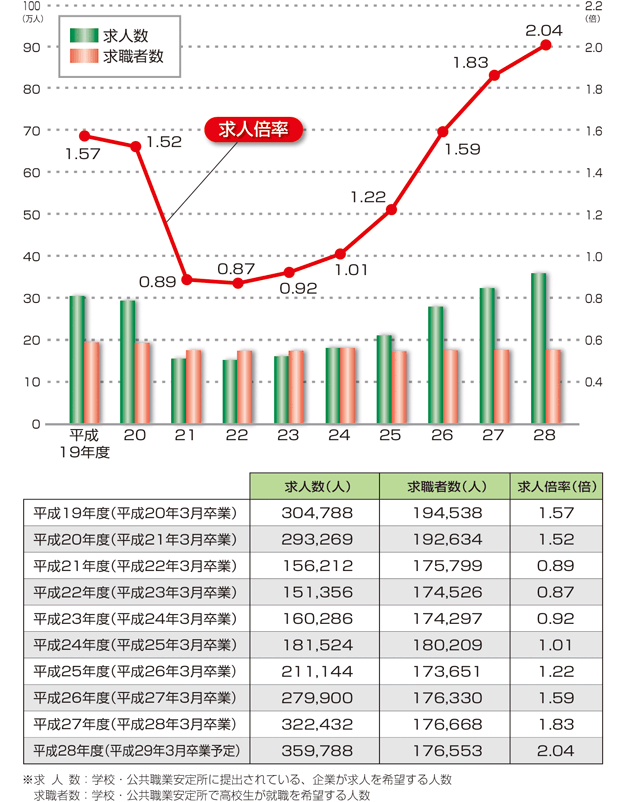 | データ資料: | 平成28年度高校・中学新卒者の求人・求職・内定状況(平成28年9月末現在)について <厚生労働省のホームページ>よりグラフ・表にして作成 |