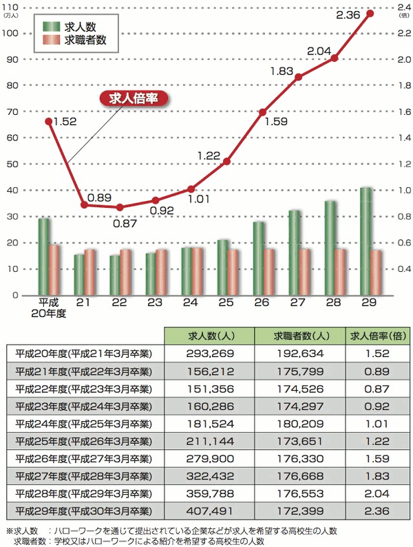 | データ資料: | 平成29年度「高校・中学新卒者のハローワーク求人に係わる 求人・求職・就職内定状況」取りまとめ(平成29年9月末現在) <厚生労働省のホームページ>よりグラフ・表にして作成 |