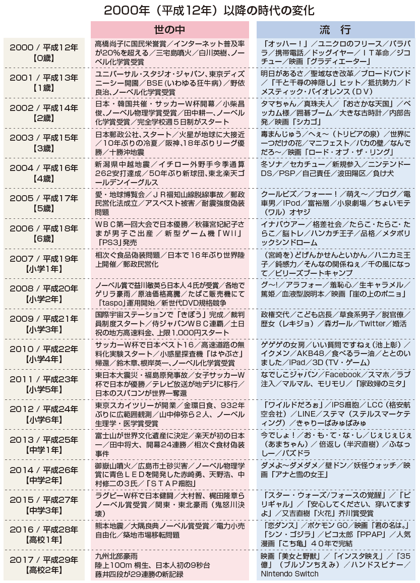 | 現在の高校3年生が生まれた年から、昨年までの「世の中」と「流行」をまとめま した。彼らの人間像を理解するための一助としてご高覧いただければ幸いです。 |