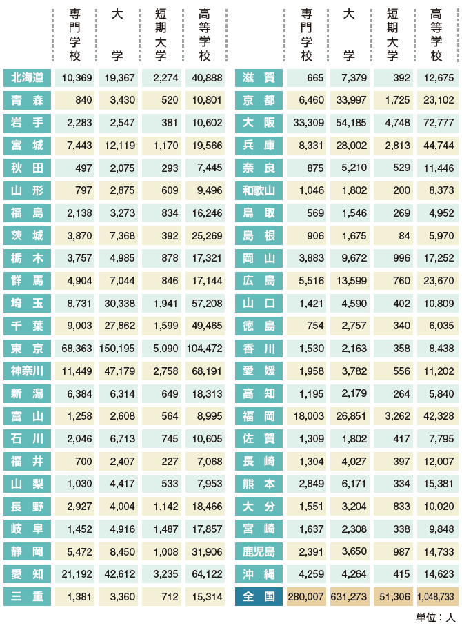 | 都道府県別/専門学校・大学・短期大学・高等学校 |