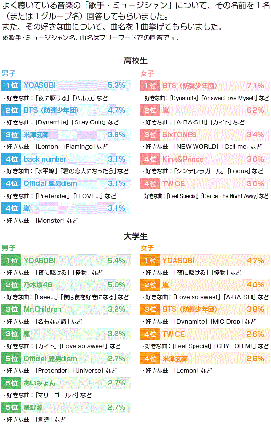 | 回答者数: | 高校生 男子358人/女子675人 大学生 男子222人/女子423人 |