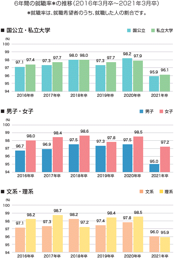 | データ資料 | : | 「令和2年度大学等卒業者の就職内定状況調査」 (文部科学省ホームページ)よりグラフにして作成 |