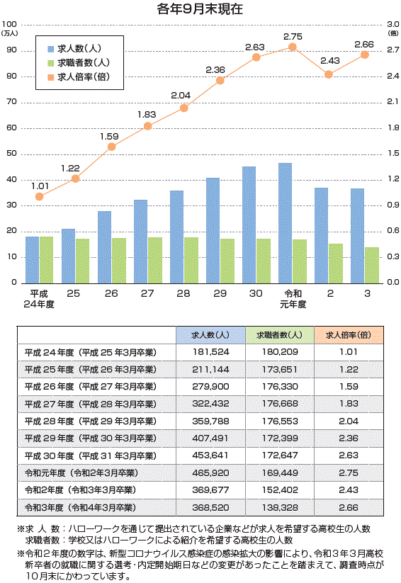 | データ資料 | : | 「令和4年3月高校・中学新卒者のハローワーク求人における求人・求職・就職内定状況」(9月末現在) 厚生労働省のホームページよりグラフ・表にして作成 |