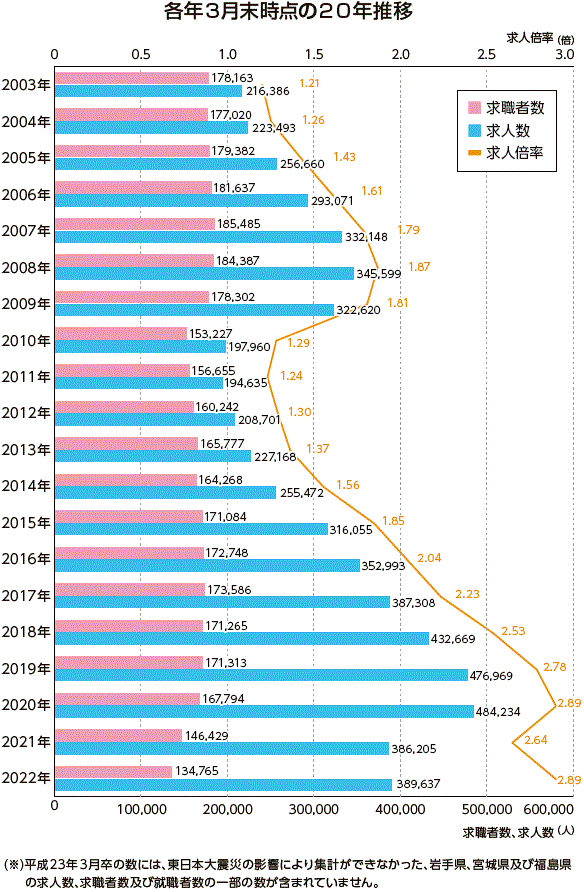| データ資料 | : | 令和3年度「高校・中学新卒者のハローワーク求人に係る求人・求職・就職内定状況」(令和4年3月末現在)厚生労働省のホームページよりグラフにして作成 |