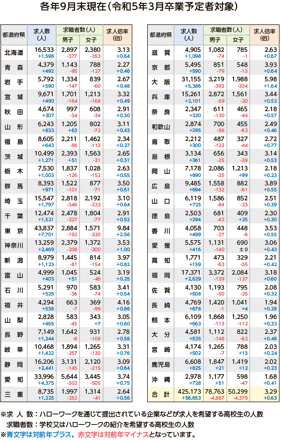 | データ資料 | : | 「令和4年度 高校・中学新卒者のハローワーク求人に係る求人・求職・就職内定状況取りまとめ(令和4年9月末現在)」 厚生労働省のホームページよりグラフ・表にして作成 |