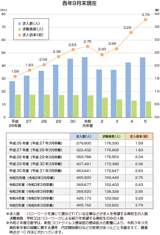 | データ資料 | : | 令和5年度「高校・中学新卒者のハローワーク求人に係る求人・求職・就職内定状況」取りまとめ(9月末現在) 厚生労働省のホームページよりグラフ・表にして作成 |