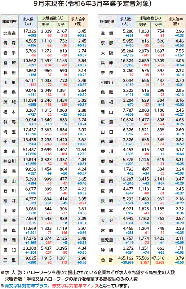 | データ資料 | : | 令和5年度「高校・中学新卒者のハローワーク求人に係る求人・求職・就職内定状況」取りまとめ(9月末現在) 厚生労働省のホームページよりグラフ・表にして作成 |