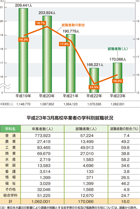 | データ資料: | 「平成23年3月高等学校卒業者の就職状況(平成23年3月末現在)に関する調査について」 <文部科学省初等中等教育局児童生徒課> |