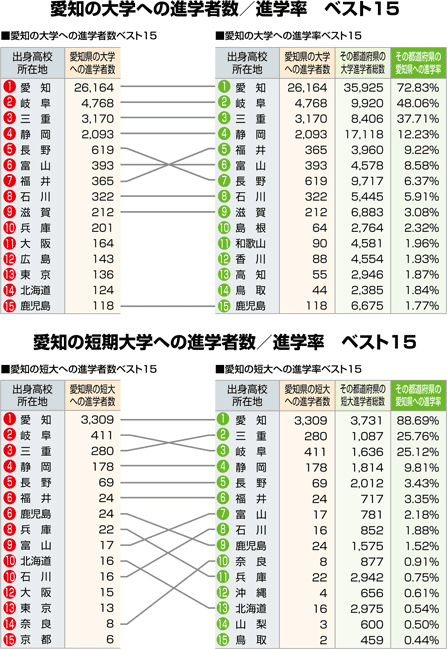 | 愛知への進学者数と「大学・短大進学者のうち何%が愛知に進学したか」という進学率の2つの視点から都道府県別にまとめました。 |