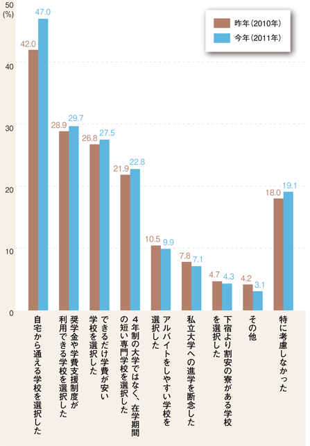 | 調査対象: | (2010年)専門学校に進学した2010年3月高校卒業生1,752人 (2011年)専門学校に進学した2011年3月高校卒業生1,391人 |