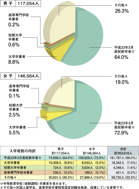 平成23年4月専門学校入学者のうち、同年3月に高校を卒業した学生(新卒入学者)の占める割合は、男子64.0%、女子72.9%です。 |