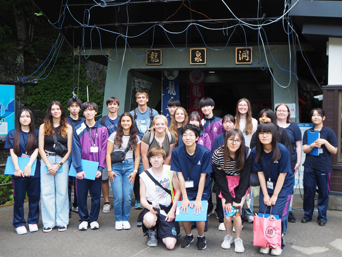 2025年も6月18・19日の両日、同校生徒は岩泉町の姉妹都市、米ウィスコンシン州デルズ市の留学生と交流。18日は郷土芸能の中野七頭舞と弓道を披露した後、「KIZUKIプロジェクト」観光班の生徒が、日本三大鍾乳洞の一つ「龍泉洞」を英語で案内した。