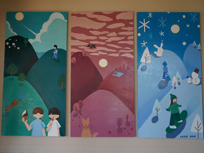 美術部が取り組んだのは、2024年に奥中山高原のスキー場が開業50周年、ホテルが開業30周年を迎えた記念にベニヤ板(縦182cm、横91cm)3枚に描いたアクリル画。それぞれ高原の夏、秋、冬の3つのシーズンをイメージしている。